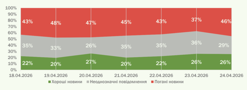 ГО CAT-UA дослідила новини та емоції щодо війни, які панували в українських соцмережах протягом минулого тижня 18-24 квітня 2026 р. Індекс настроїв соцмереж склав мінус 21 (був мінус 18). А саме: хороші новини склали 23%, погані – 44%, неоднозначні – 33%.